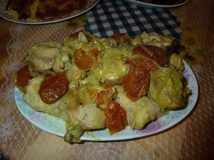 Stavite komade piletine u zasebnu tavu, pospite solju i crnim paprom po želji, dodajte malo vode i pirjajte 15 minuta. U drugoj tavi pržite nasjeckani luk na biljnom ulju 5 minuta. Zatim mu dodajte sok od pola limuna, šećer, oprane marelice i žličicu gheeja. Promiješajte luk i pržite još 5 minuta na umjerenoj vatri.