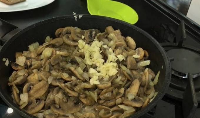 Mljeveno meso posolite, dodajte mu začine po ukusu. Gljive narežite na male kriške, pomiješajte gljive s mljevenim mesom. Krumpir operite, ogulite, narežite na male kockice, luk narežite na kolutiće. Sir utrljajte na krupno ribež. Za umak pomiješajte kiselo vrhnje s majonezom, ubacite jaje, češnjak prošao kroz prešu, posolite, popaprite, po želji dodajte zelje.