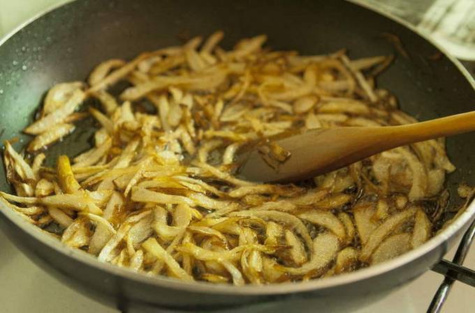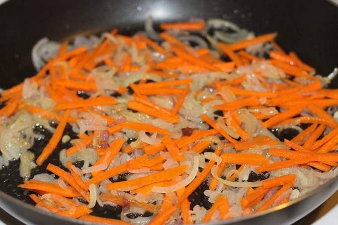 Tijesto za tortu od jetre podijelite na 2 jednaka dijela. Prvu stavite u namašćenu posudu za pečenje. Na vrh stavite mješavinu luka i mrkve i malo je zdrobite lopaticom. Pokrijte povrće drugim slojem tijesta, a po vrhu rasporedite nadjev od kiselog vrhnja i jaja. Stavili smo oblik u pećnicu, zagrijavajući ga na 180 stupnjeva. Kolač pečemo 30 minuta.