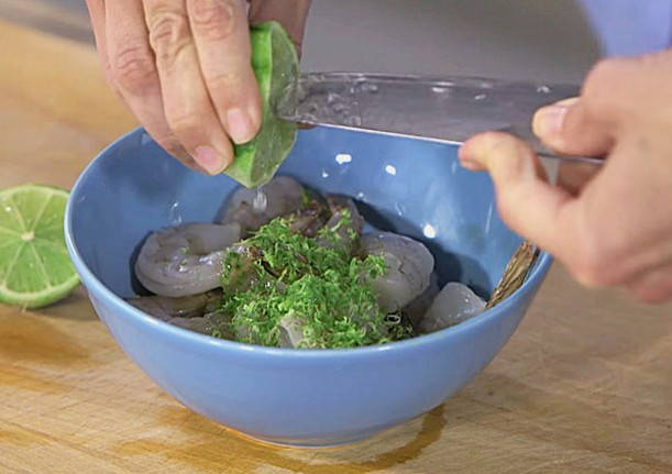 Škampe dobro isperite hladnom vodom, pažljivo uklonite ljusku. Za pripremu marinade u zasebnoj zdjeli pomiješajte maslinovo ulje (2 žlice), sol, crni papar po ukusu, češnjak prošao kroz prešu. Limetu ili limun operite vrućom vodom, osušite, uklonite koricu posebnim nožem ili sitnim ribežom. Prerežite na dvije polovice i iscijedite sok. Dodajte dvije žlice limunova soka i žličicu korice u zdjelu maslinovog ulja. Sve dobro promiješajte, umočite škampe u smjesu, lagano ih okrenite da ih potpuno umočite u marinadu. Ostavimo da odstoji nekoliko minuta.