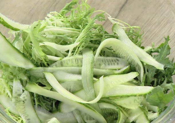 Operimo i osušimo krastavac. Odrežite vrhove. Izrežite oštrim nožem na tanke, ravne ploče nalik na vrpcu. U tu je svrhu također prikladno koristiti ljuskalicu za povrće s prorezima. Nasjeckane krastavce stavite u zdjelu za salatu s začinskim biljem, a na vrh prelijte preostale dvije žlice maslinovog ulja. Posolite i popaprite po ukusu, pomiješajte s dvije vilice.