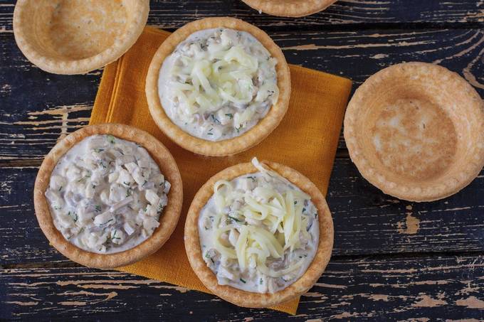 Julienne se može poslužiti na svečanom stolu kao vruće predjelo, za to su vam potrebni tartleti od prhkog tijesta ili lisnatog tijesta. U ovom predjelu gljive i kremasti umak ostaju nepromijenjeni.