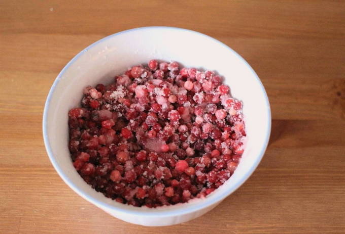 Az áfonyát öblítse le egy tál vízzel, hogy ne sértse meg. Gyűjtse össze az összes lebegő törmeléket a víz felszínéről, engedje le a folyadékot, és öblítse le a bogyókat szűrőedényben, és szárítsa meg törülközővel. Egy tálba tesszük, hozzáadjuk a keményítőt és a cukrot, és óvatosan addig keverjük, amíg a gyümölcsök teljesen el nem fedik a keveréket.