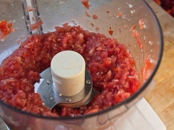 Öblítse le a piros paprikát és vágja közepes méretű kockákra. A friss uborkát megmossuk, félbevágjuk, és egy teáskanál segítségével megtisztítjuk a magoktól. Ezután apró darabokra vágjuk. A paradicsomot megmossuk, mély tálba tesszük, forró vízzel megtöltjük és 2-3 percig hagyjuk, majd hideg vízzel felöntjük, és eltávolítjuk a héját.