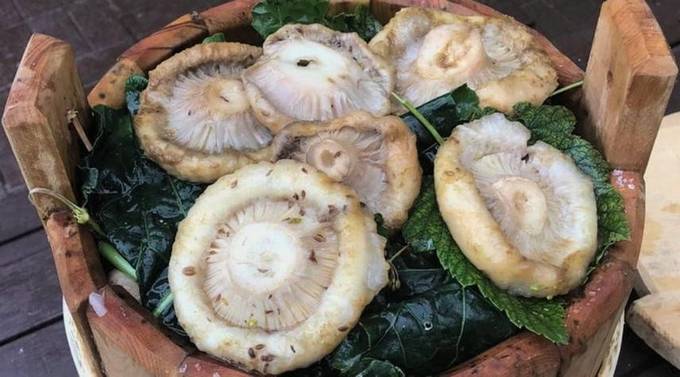Tegyen egy réteg levelet, fokhagymát, gyökeret, kaprot a hordó aljára, adjon hozzá sót. Ezután tegyen egy réteg gombát körülbelül 7 cm vastagra, szórja meg sóval, tegyen gyógynövényeket. Ismételje meg a manipulációkat, amíg a gombák el nem fogynak. A sót egyenletesen eloszlatja az összes rétegen. Fedje le a gombát gézzel, nyomja le a tetejét elnyomással. Pár nap múlva a gombáknak gyümölcsleve lesz.