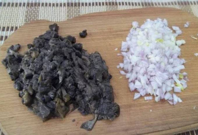 Tegyen egy serpenyőt a tűzre, és öntsön egy kis mennyiségű növényi olajat. Itt megkenjük a darált húst hagymával. Amikor a darált húst világos aranybarnára sült, adjunk hozzá paradicsompürét. A darált húst ízlés szerint sóval, fekete borssal és más fűszerekkel is fűszerezzük. Mindent összekeverünk, fedjük le a serpenyőt fedéllel, és tartalmát kis lángon pároljuk körülbelül 10 percig.