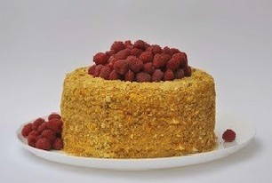 Szép és ízletes mézes sütemény jól illik a bogyókhoz. A málna kellemes friss ízt kölcsönöz a desszertnek, és látványos dekorációként is szolgál.