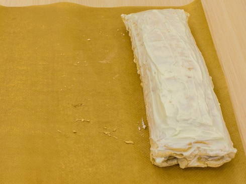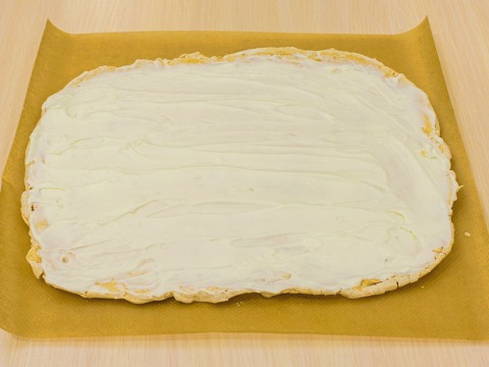 A habcsókot sütőben megsütjük. Ezután krém túrót, cukrot és tejszínt fektetnek rá. Bogyókat teszünk a tetejére, és mindent csinos tekercsbe csavarunk.