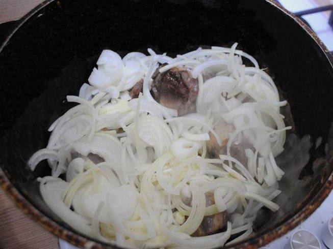 A pirított hús tetejére apróra vágott hagymát teszünk. Mindent együtt pirítunk, amíg a hagyma aranybarna nem lesz. Ezután öntsön fel annyi forró vizet, hogy teljesen ellepje a marhahúst. Főzzük a húst a kapott húslevesben harminc -negyven percig. A húslevesnek el kell párolognia, és a marhahúsnak meg kell puhulnia.