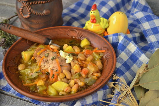 Öntsön kis mennyiségű növényi olajat egy nagy, vastag aljú edénybe. A zellert, a sárgarépát és a hagymát tegyük egy serpenyőbe, és süssük magas lángon, amíg megpuhul. Ezután vigye át az elkészített burgonyát, és fedje le csirkehúslevessel, főzze 20 percig. Hozzáadjuk a babot, a savanyúságot, a fűszereket, és további 15 percig főzzük.