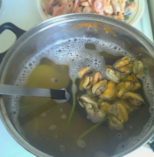 Tegyünk egy szelet citromot, petrezselyem- és kaprot egy edénybe vízzel, adjunk hozzá sót és borsot. Miután a víz felforrt, hozzáadjuk a garnélarákokat, forraljuk 3-4 percig. Ha kész, vegye ki egy réses kanállal, és tegye a kagylót a vízbe. Forraljuk őket 5-6 percig. Ha kész, kivesszük őket egy tányérra.