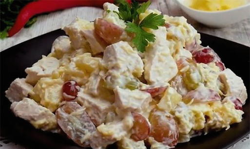 Saláta csirkével, ananásszal, sajttal és szőlővel