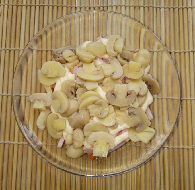 Először is el kell készítenie azokat az összetevőket, amelyeket felhasználunk a saláta elkészítéséhez. Vegyük a sonkát és vágjuk közepes méretű kockákra. A gombát megmossuk és serpenyőben megsütjük. A főtt tojást lereszeljük. Ugyanezt a manipulációt végezzük a sajttal. Vágja fel a chipset. Ebből a célból használhat konyhai kalapácsot.