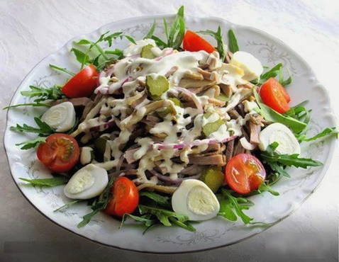 A saláta nyelvvel és gombával egy másik lehetőség egy ünnepi asztali ételhez. A főtt nyelv kiváló kombinációja sült gombával, friss rukkolával és cseresznyeparadicsommal. Kicsit diverzifikáltuk az öltözködést - ez nem csak majonéz, hanem mártás is, illatos olívaolajjal, citromlé savanyúságával és fűszeres mustárral egészítettük ki.