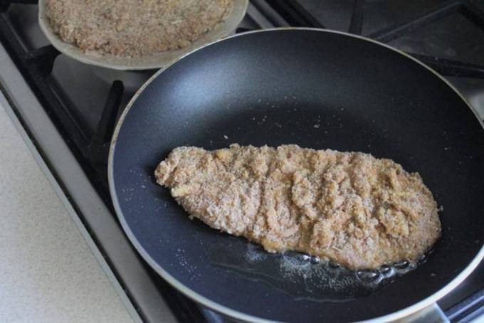 A törött filé tányérokat először lisztbe forgatjuk, majd a tojásos-sajtos masszába merítjük, majd zsemlemorzsás tálba tesszük, és minden oldalról jól megszórjuk a szeletre. A panírozás jobb megőrzése érdekében enyhén megnyomhatja az ujjaival. Egy serpenyőben melegítsünk fel kis mennyiségű növényi olajat, amíg felforrósodik. Tegye a schnitzelt és süsse őket közepes hőmérsékleten mindkét oldalán két -három percig, amíg egyenletes aranybarna héjat nem kap.