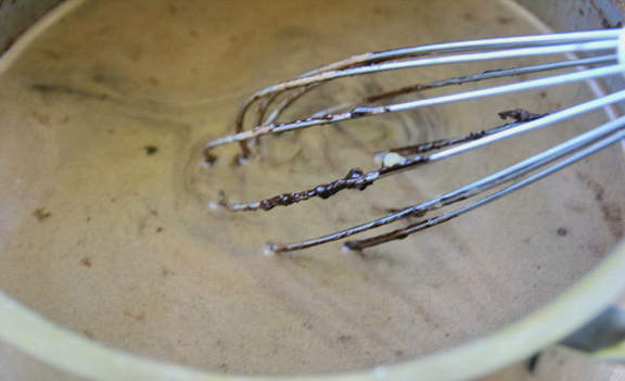 A tojást egy tálba törjük, hozzáadjuk a kristálycukrot és a kakaóport. Keverjük össze mindent habverővel, hogy az összes csomó eltörjön, és homogén masszát kapjunk. Ezután adjunk hozzá mézet és öntsük hozzá a tejet, keverjük össze mindent habverővel. Ha a méz szilárd, akkor először fel kell olvasztani folyékony állapotba a mikrohullámú sütőben.