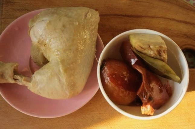 A sült hagymát és sárgarépát mártsuk a céklába. Hámozzuk meg a fokhagymát, nyomjuk át egy présen, és tegyük a levesbe. Adjunk hozzá sót, cukrot, reszelt szerecsendiót ízlés szerint. Keverjük össze és vegyük le a céklát a tűzhelyről.