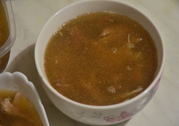 Mettere le cosce, le ali e il manzo preparati in una casseruola e versare la quantità d'acqua indicata. Portare a bollore, togliere la schiuma che si forma, ridurre al minimo la temperatura del fornello e cuocere a fuoco lento per sei ore. Sbucciare le carote dalla pelle superiore. Le mie cipolle, ma non sbucciamo la buccia - darà un bel colore al brodo. Un'ora prima della fine della cottura, mettere in padella le verdure intere preparate, l'erba cipollina sbucciata, l'alloro, il pepe in grani e il sale qb.