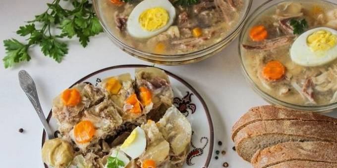 Offriamo di cucinare carne in gelatina di pollo e manzo. Usiamo l'intera carcassa di pollo per questo. Prendiamo anche uno stinco di manzo - un osso con un'articolazione. È importante far bollire le materie prime a ebollizione minima in modo che il brodo rimanga pulito e trasparente. Usiamo verdure bollite, erbe aromatiche e uova per la decorazione. Tale carne in gelatina è adatta come spuntino freddo, nonché uno spuntino abbondante e salutare.