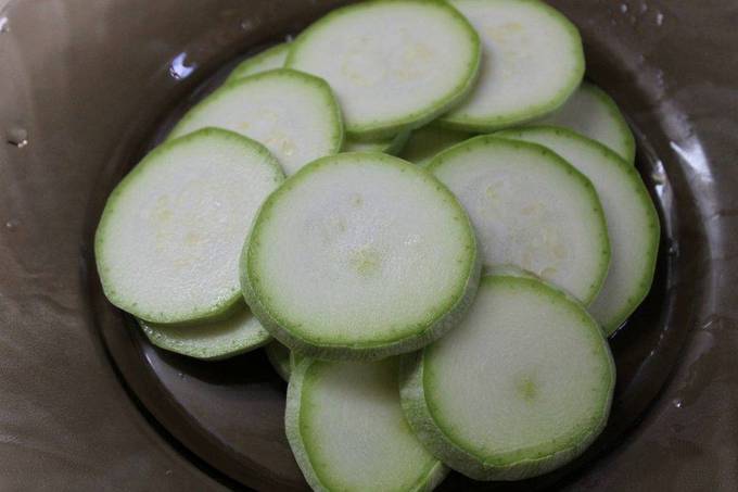 Accendiamo il forno per il riscaldamento, impostando la temperatura a 180 gradi. Laviamo le zucchine, quindi le tagliamo a cerchi di media grandezza. Se la zucchina è giovane, non è necessario rimuovere la pelle da essa. Distribuiamo le zucchine preparate in una teglia. Cospargere leggermente con sale e pepe macinato.