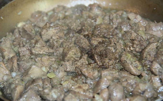 Lavate i fegatini di pollo in acqua corrente, eliminate tutte le pellicole e i vasi venati. Dopo averle lavate, mettete le frattaglie in uno scolapasta e lasciate scolare l'umidità in eccesso. Quindi tagliamo il prodotto a pezzi. Metti il fegato preparato in una padella con le cipolle semicotte, mescola e friggi per due o tre minuti a fuoco medio. A fine cottura aggiustate di sale e pepe nero a piacere, sfumate anche con il vino rosso dolce. Mescolare e togliere dal fuoco.