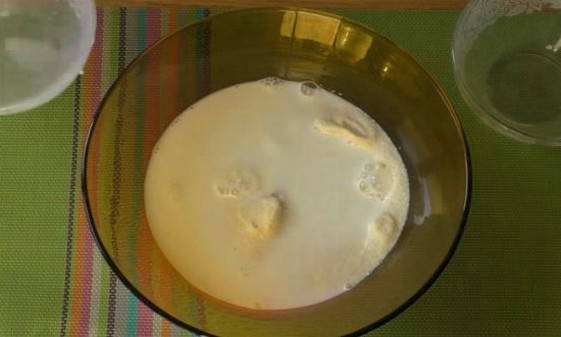 Rompete le uova in una ciotola a parte, aggiungete lo zucchero semolato, il sale e la vanillina. Agitare i componenti con una frusta fino a quando non sono completamente collegati. Quindi aggiungere il burro ammorbidito, il lievito e frullare ancora il tutto. Infine aggiungete il semolino gonfio con il latte acido e mescolate.