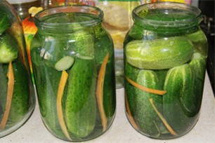 Metti chiodi di garofano, aglio, mezza cipolla grande sul fondo di barattoli sterili, taglia le punte dei cetrioli secchi e distribuiscili strettamente l'uno all'altro in contenitori. Tagliare le carote in quarti e metterle nel barattolo tra i cetrioli. Se ti piace il piccante, aggiungi i peperoncini piccanti. Metti il sale grosso, lo zucchero semolato, versa l'aceto da tavola.