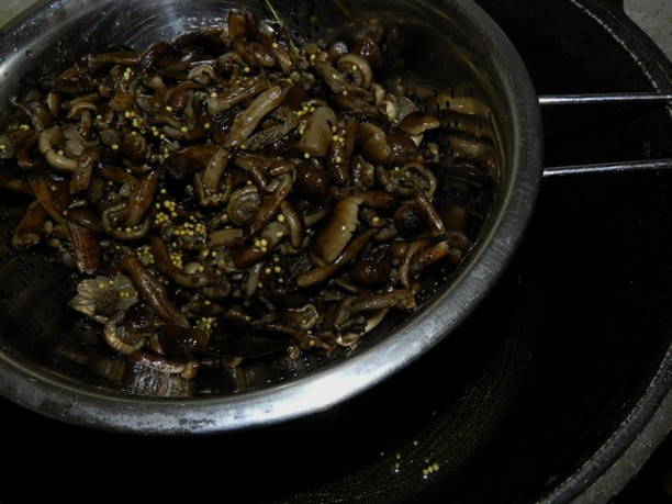Avvitare con tappi sterili. Capovolgete i vasetti con i funghi, avvolgeteli in una coperta calda e lasciateli in questo stato fino a quando non si saranno raffreddati completamente per circa un giorno. Dopo il completo raffreddamento, capovolgere i vasetti e trasferirli in un luogo fresco e buio per la conservazione.