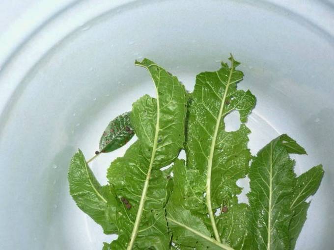 Lo strato finale è foglie e spezie. Coprire i pomodori con loro, aggiungere le spezie. In un barattolo da un litro, diluire il sale con acqua di sorgente o corrente filtrata, mescolare bene con un cucchiaio in modo che il sale si sciolga completamente e versare la soluzione risultante in un secchio. Quindi, versa l'acqua nel secchio. Coprire i pomodori con un piatto largo e adagiarvi sopra il carico. Può essere una grande pietra o un vaso d'acqua. Mettiamo un secchio di pomodori in un luogo fresco o in cantina e lo lasciamo per un mese. Controlliamo periodicamente i pomodori: se compare della muffa sulla parte superiore, toglietela e lasciate riposare i pomodori. In un mese, i deliziosi pomodori in salamoia sono pronti, puoi assaggiarli!