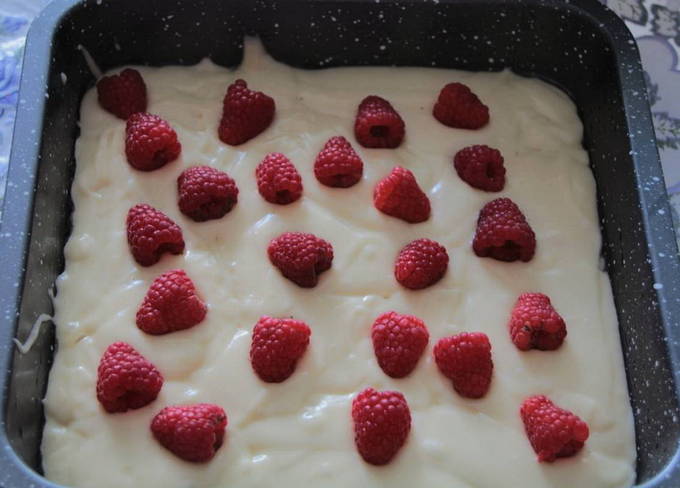 L'impasto di kefir, farina, burro, uova, zucchero, lievito, vanillina e sale viene versato in una teglia. I lamponi sono disposti sopra e la torta viene cotta per 40 minuti. Sarà un'ottima aggiunta al tè, poiché risulta essere molto gustoso e aromatico.