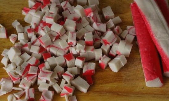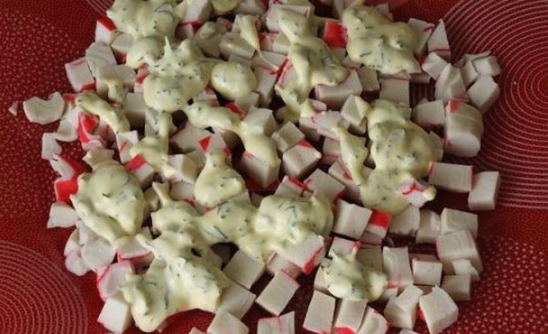 Il tocco finale è il condimento per l'insalata. Apriamo con cura i bastoncini di granchio sinistro in uno strato piatto. Tagliatela a striscioline sottili. disponi le cannucce a forma di fiore attorno alla circonferenza dell'insalata, come nella foto. Al centro, puoi adagiare uno scivolo di formaggio grattugiato. Applicare un bordo di aneto attorno alla circonferenza. Mettiamo l'insalata in frigorifero per un'ora a bagno, quindi la serviamo sul tavolo.