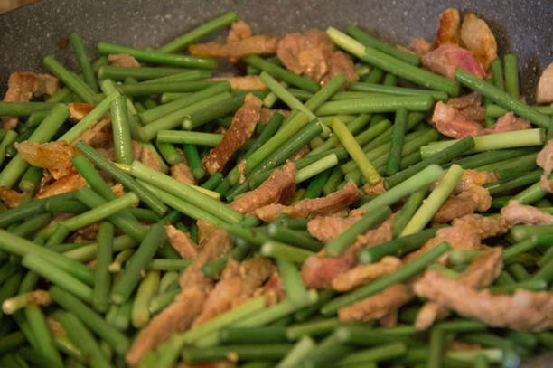 Per una scelta di successo dei germogli di aglio, devi seguire alcuni consigli: i germogli giovani e freschi sono croccanti e si rompono bene quando piegati, e quelli non molto giovani non hanno più tale succosità e si piegano semplicemente. Laviamo bene i germogli d'aglio in acqua fredda corrente. Lascia scolare un po' l'acqua e metti i germogli su un tagliere. Tagliateli a pezzetti lunghi circa 4-6 cm.