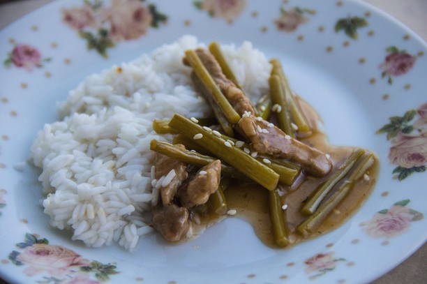Durante il processo di cottura, i germogli di aglio hanno cambiato il loro colore in un colore più chiaro e sono diventati un po' più morbidi. Aggiungi 4 cucchiaini al nostro piatto. salsa di soia e mescolare bene. Chiudete il coperchio e lasciate in ammollo la carne e i germogli nella salsa. A questo punto, in un piccolo contenitore, diluiamo l'amido con una piccola quantità d'acqua, in modo che la sua consistenza sia un po' liquida, aggiungiamo un altro 1 cucchiaino. salsa di soia e mescolare bene. Aggiungi il condimento risultante al nostro piatto, mescola e togli dal fuoco dopo 1-1,5 minuti. L'amido comincerà ad addensarsi e la salsa comincerà a diventare limpida e viscosa. A questo punto fate rosolare i semi di sesamo in una padella calda e asciutta per 1-2 minuti in modo che prendano un po' di colore e aggiungeteli alla carne. Amalgamare bene il tutto.