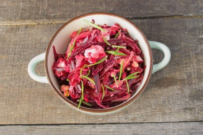 Una meravigliosa insalata di barbabietole bollite e cipolle fritte aiuterà a migliorare la digestione. Non contiene maionese, il condimento è composto da olio d'oliva di qualità e salsa di soia. Oltre agli ingredienti principali, sono incluse anche noci e formaggio feta.