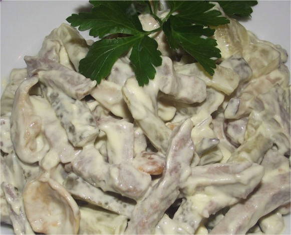 I funghi salati sono un delizioso spuntino a sé stante. Prova a fare un'insalata con loro e rimarrai piacevolmente sorpreso da come suonano i funghi salati se abbinati a lingua e sottaceti. L'insalata è facile da preparare, ma per ridurla al minimo, fai bollire la lingua in anticipo.
