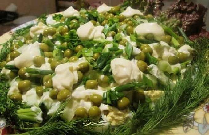 Una versione interessante dell'insalata con i calamari. I piselli completano bene questi frutti di mare: entrambi hanno una consistenza densa in qualche modo simile che si rivela bene sullo sfondo di uova delicate. Per freschezza e aroma, aggiungi cipolle verdi, darà anche macchie di colore verde brillante. La maionese è ottima come condimento. A proposito, una tale insalata può essere servita non solo tradizionalmente in un'insalatiera, ma anche riempita con cestini di sfoglia, profiteroles, frittelle o pane pita. Sarà un ottimo antipasto freddo.