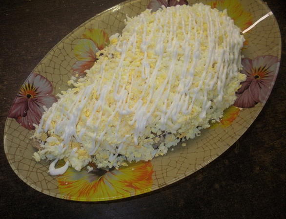 Raffreddare la carne di pollo, separarla dalle ossa e dalla pelle e tritarla. Tagliare l'uva a metà, eliminare i semi se necessario. Grattugiare il formaggio a pasta dura e le uova di gallina sbucciate su una grattugia grossa. Sbucciare la mela e tagliarla a cubetti. Tritare le noci con un coltello.