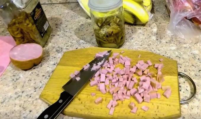 Metti i funghi in un'insalatiera preparata, se i funghi sono grandi, tagliati in più pezzi, aggiungi il prosciutto tritato. Apri una lattina di fagioli rossi in scatola, scola il liquido con un colino e metti i fagioli in un'insalatiera. Sbucciare lo spicchio d'aglio, tritarlo con un coltello o spremerlo con una pressa.