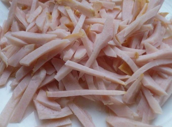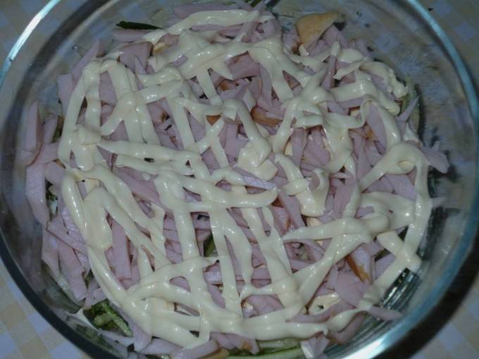 L'insalata di prosciutto e formaggio è un'insalata leggera a strati che cuoce in pochi minuti ma scompare rapidamente anche dalla tavola. Se prendi prosciutto a basso contenuto calorico e formaggio magro e prepari il condimento con yogurt greco o panna acida, il contenuto calorico del piatto diminuirà e l'insalata diventerà più sana. Il cetriolo aggiungerà freschezza al piatto. Usa erbe fresche per la decorazione. L'insalata è semplice e gustosa. Puoi trattare gli ospiti inaspettati con una tale insalata. L'insalata può essere servita in una grande insalatiera o porzionata in bei bicchieri.