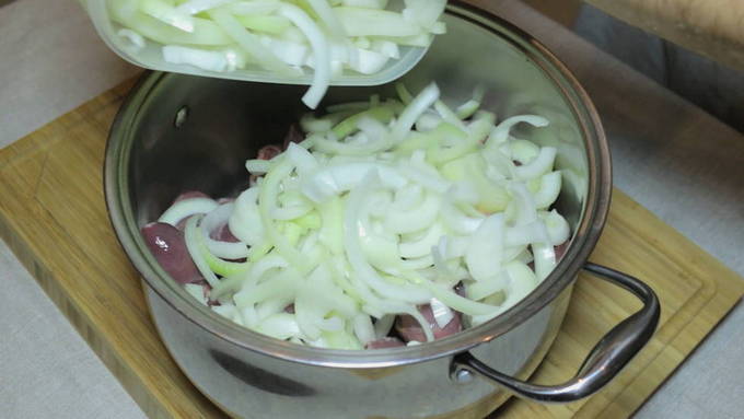 Per prima cosa sciacquate i cuori di tacchino con acqua corrente. Quindi utilizzare un coltello affilato o delle forbici per rimuovere il grasso e i resti dei vasi sanguigni. Tagliare ogni cuore, rimuovere l'eventuale sangue residuo e risciacquare abbondantemente. Poi asciugate i cuori con un canovaccio e metteteli in una pirofila.