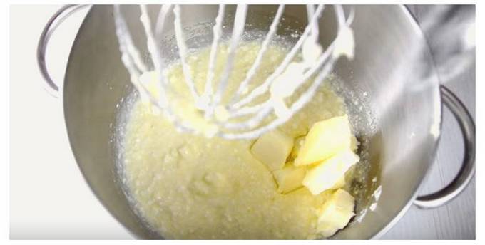 Per prima cosa preparate l'impasto per l'impasto. Versare il latte riscaldato in una ciotola separata, aggiungere il lievito secco, un cucchiaio di zucchero e 3 cucchiai di farina, mescolare bene e mettere questo composto in un luogo caldo fino a quando l'impasto non diventa 2-3 volte più grande. In una ciotola del frullatore o in una ciotola separata con un mixer, sbattere tre uova di gallina con tre tuorli e il resto dello zucchero fino a ottenere un composto omogeneo.