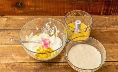 Laviamo l'arancia sotto l'acqua corrente, la asciugiamo con un canovaccio e strofiniamo la scorza d'arancia su una grattugia fine, rimuovendo con cura solo la parte di arancia, e aggiungiamola all'impasto. Quindi sbucciamo l'arancia, la smontiamo a fette e la puliamo dalle partizioni. Mettere la polpa d'arancia in un frullatore e macinare. Rompete le uova in una ciotola dell'hotel, aggiungete lo zucchero e sbattete con un mixer fino a renderle spumose.