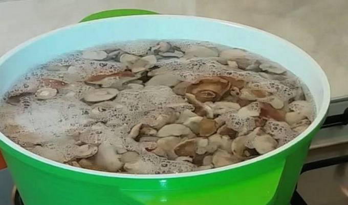 Separare accuratamente la fila di pioppo, quindi pulirla da vari detriti e sciacquare i funghi sotto l'acqua corrente fredda. Tagliare i campioni grandi in più pezzi. Metti la fila preparata in una casseruola profonda e riempila con acqua fredda. Metti a fuoco medio, porta a ebollizione e poi fai sobbollire i funghi per 15-20 minuti a fuoco basso.